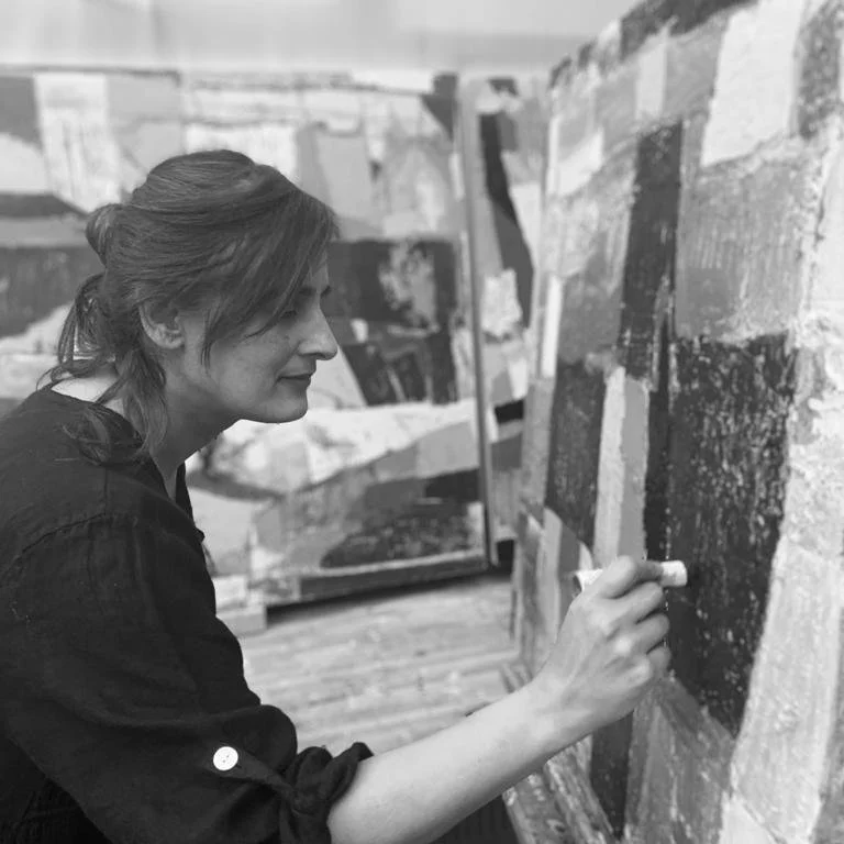 Her paintings are instinctual expressions; led by intuition and feeling, tempered with conscious thought. She sketches directly onto canvas and then responds; creating textures, layering paint and other media with boldness and energy. The materiality of paint inspires her and so it is explored and optimised; it is thickened, thinned, trowelled on, pasted, scraped back, poured, smeared, splashed, sanded. Planes of colour and shape invite the viewer in directing towards further exploration; details of the physical surface texture, the hidden, the yet unexplored, the veiled, the obvious are all contained. Collage and other media are embedded. The surface is manipulated with a variety of tools; squeegies, scrapers, trowels and the occasional paintbrush. All the while adjusting, balancing and harmonising shape, colour, line, texture etc in order to nudge a painting towards becoming. Multiple paths, outcomes and destinations are considered. Cycles of growth and permanence follow destruction and concealment, follow stale mate and so on. Painting requires faith, resilience and courage but the risks are worth the reward.